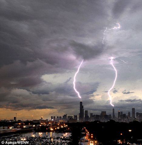 Bolt from the blue: Seen from the Hancock Tower, lighting strikes both the Willis Tower, right, and the Trump Tower in downtown Chicago as a severe storm rolls through the region last night