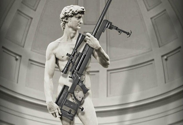 That Italian statement, if true (ok, pretty likely, although I haven't confirmed it) is as outrageous as it is hilarious. David is the quintessential warrior. While a great leader later in life, Michelangelo's work depicts him as a youth, about to .... what? Herd sheep? Have dinner? Hell no. He is about to go into battle, armed, and dangerous. The rifle is by every measure today's best equivalent of David's sling.